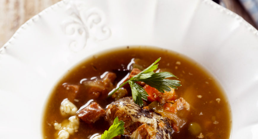 Després, afegir les verdures tallades a quadres al brou amb un rajolí de vi i julivert picat al gust. Quan les verdures estiguin toves tornarem a afegir el peix i deixarem bullir uns minuts.