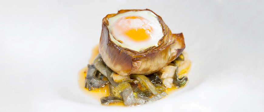 Untamos una bandeja de horno con aceite, colocamos las alcachofas ya escurridas con un chorro de aceite y dejamos que se horneen durante 10 minutos. Pasado este tiempo, abrimos las hojas e introducimos la anguila fileteada previamente marcada en la sartén y acabamos colocando el huevo de codorniz encima. Introducimos en el horno de nuevo durante sólo 3 minutos y, ¡Listo!
